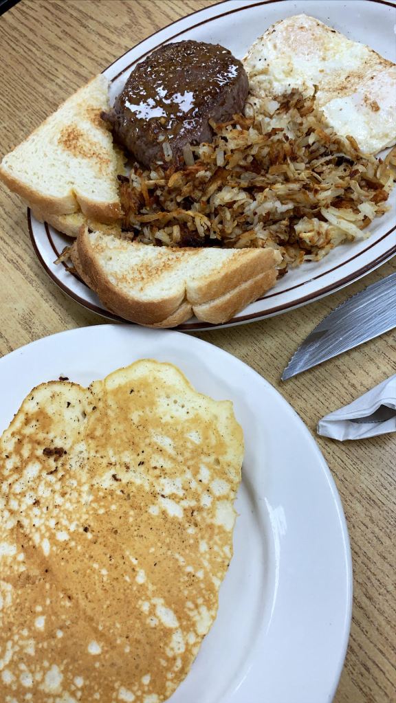 The drive was around 6 hours total. I made two stops on the trip, once to get gas and the other to eat something. The town where I got food was sooo tiny that there was only one restaurant! I got a delicious breakfast there including buffalo sausage which was by far the most juicy and flavorful sausage I have ever had 🤤